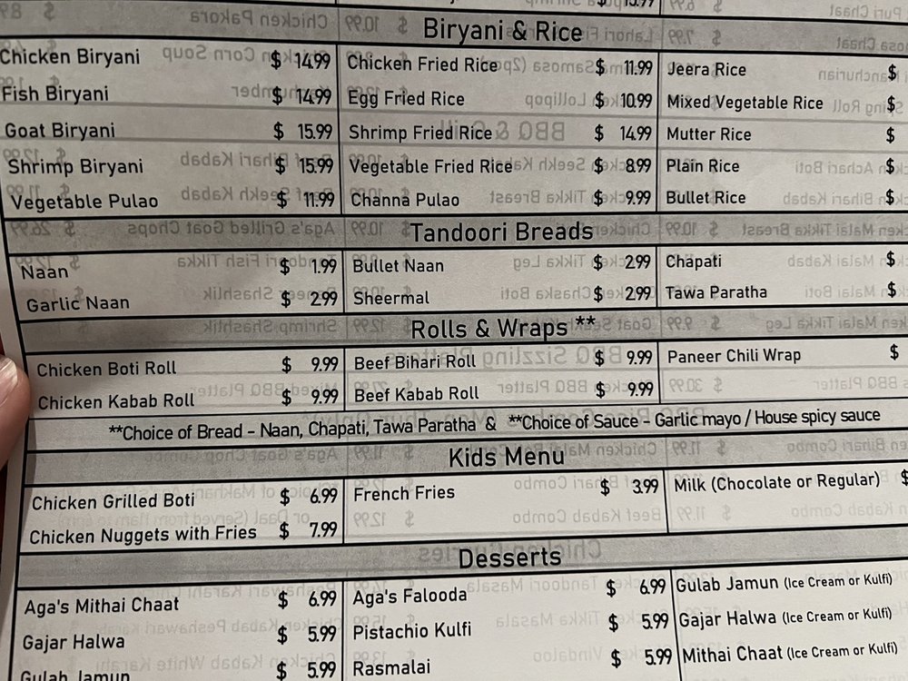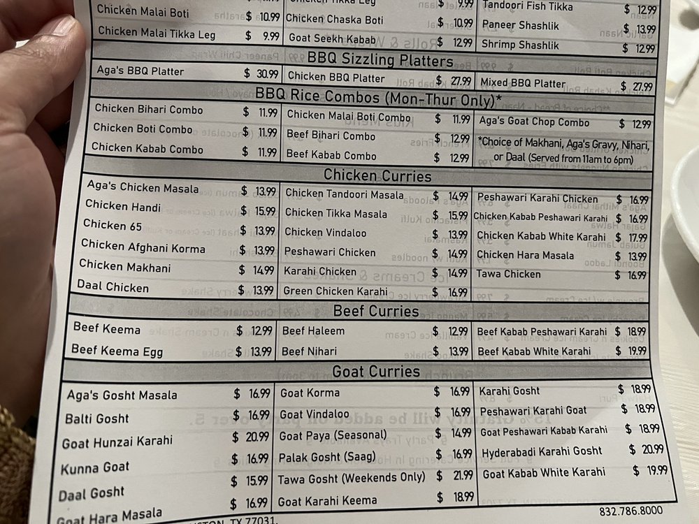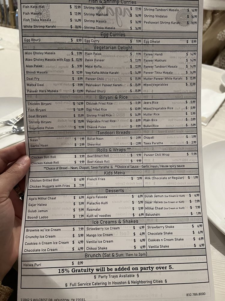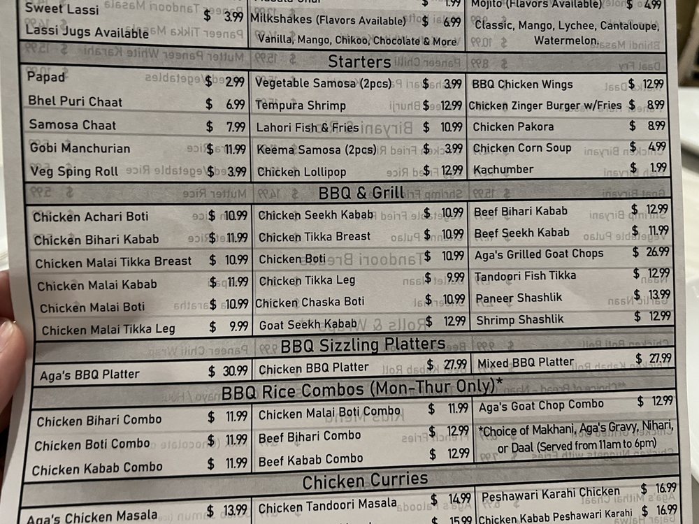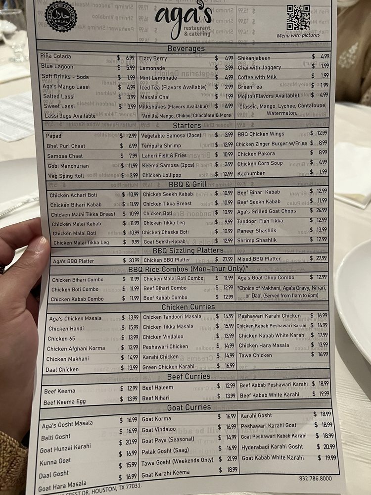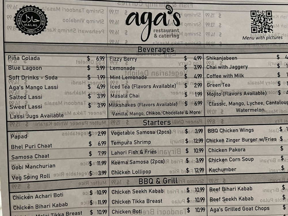 Aga's Restaurant & Catering is a bustling hub of Indian and Pakistani cuisine in Houston, offering a wide array of dishes catering to pescatarians, vegans, and vegetarians. The restaurant prides itself on accommodating large groups, ensuring everyone enjoys their dining experience. Customers rave about the flavorful garlic naan, goat chops, Chaska chicken, and butter chicken. The attentive service, fast pace, and ample seating make it a favorite spot for gatherings and celebrations. With exceptional staff like Mr. Juvaide and a variety of services like catering and private dining, Aga's stands out for its top-notch hospitality and delicious offerings. Whether you're craving traditional biryanis, spicy chicken tikka masala, or tender chicken lollipops, Aga's delivers an unforgettable dining experience. Don't miss out on exploring their menu full of vibrant flavors and exceptional dishes.